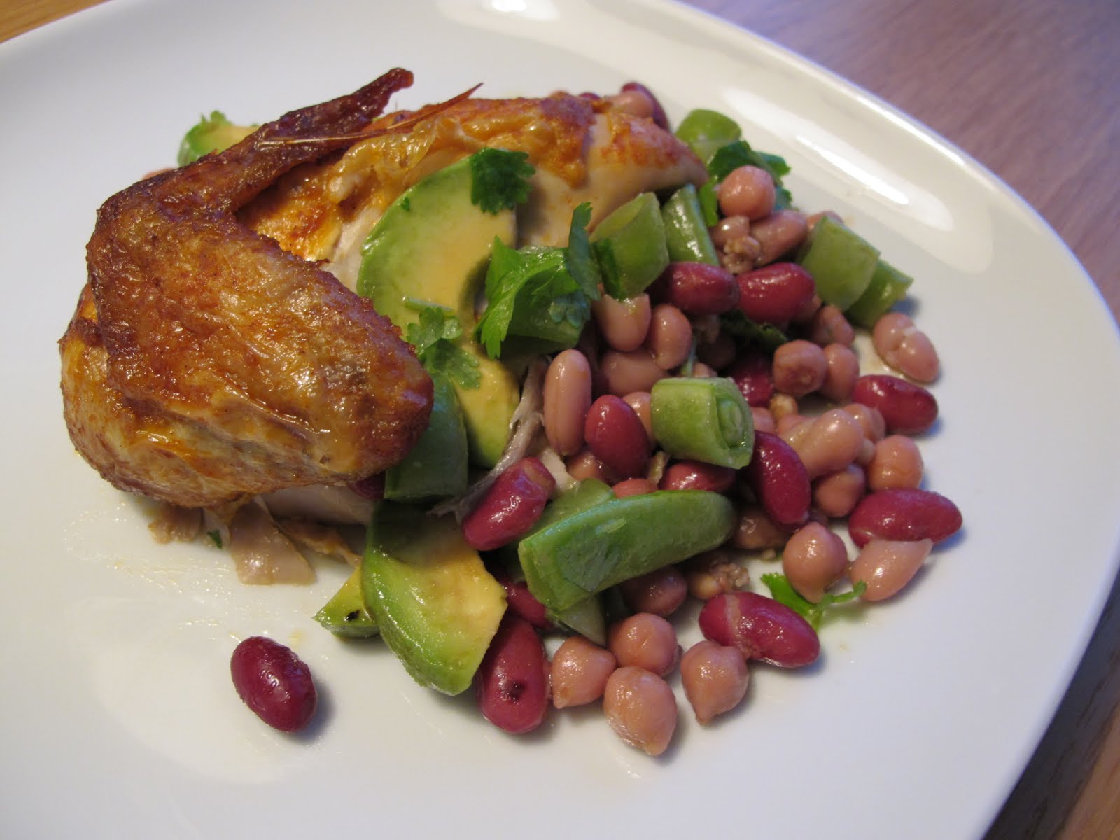 Ibland orkar man inte laga någon mat. Som på måndagar när jag har spelat badminton och kommer hem sent och är galet hungrig. Tures pappa har haft fullt upp med vår avkomma så han har inte heller haft tid att sno ihop nåt. Då får man fuska, för äta bör man annars dör man. Igår köpte jag en burk Zeta bönsallad med matvete och lite grillad kyckling. Jag sköljde bönorna och hällde på lite olivolja, citron, salt och balsamico. Jag skar upp lite avokado och sockerärtor och blandade runt. Sen slängde jag på kycklingen.