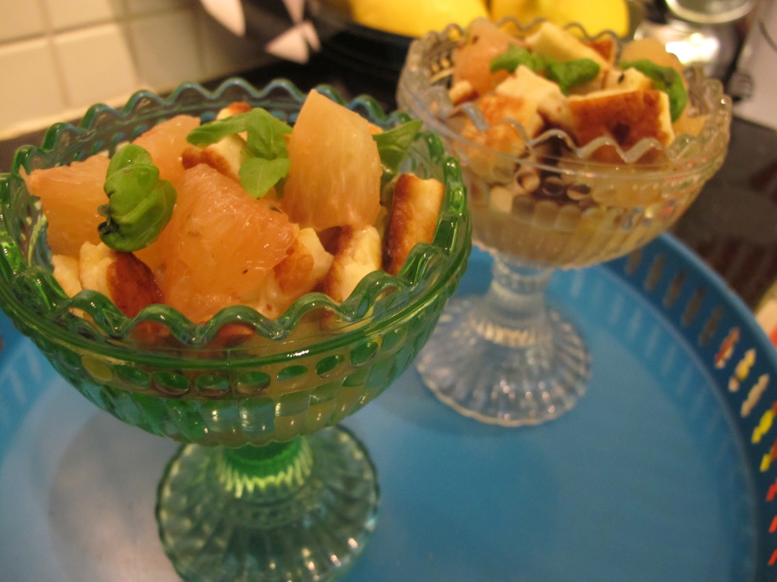 Filea grapefrukten genom att skära bort skalet på utsidan med en vass kniv så att allt fruktkött blottar sig. Skär ner mellan de vita väggarna så du får en helt "ren" grapefruktfilé. Halvera filéerna. Häll lite olivolja över grapefrukten och låt stå. Skär halloumin i sockerbitsstora tärningar. Värm lite olja och smula ner den torkade chilin. Fräs chilin en sväng och lägg sen ner halloumin. Stek osten tills du får fin yta. Ta upp osten och pressa över limen över osten. Blanda grapefrukten och osten tillsammans med lite färsk mynta. Servera på momangen!