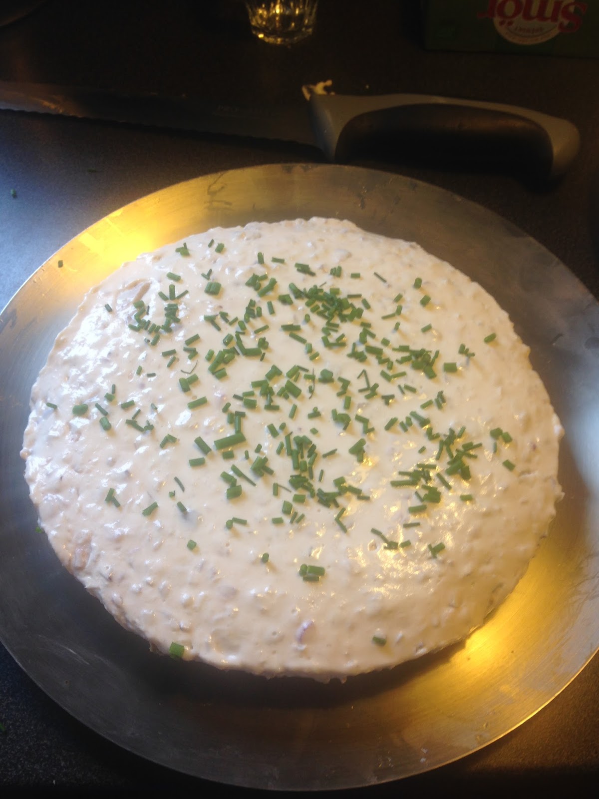 - Lägg tårtan på ett fat och garnera med gräslök.
