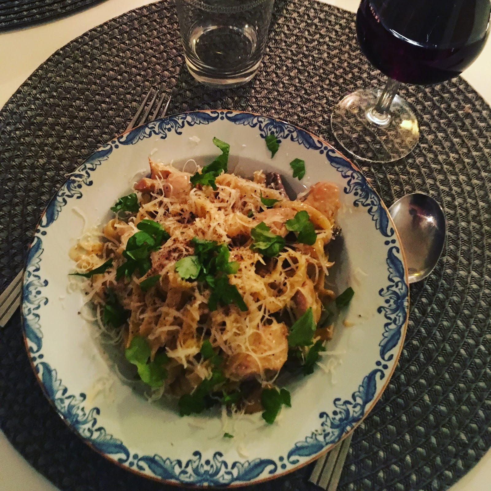 - Häll på grädden och låt kycklingen och löken puttra i den.