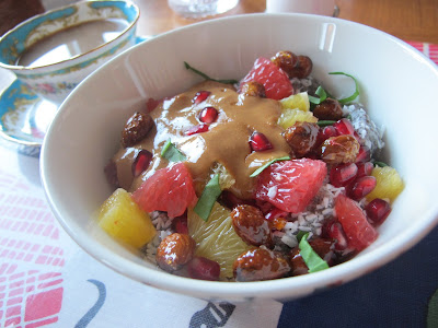 Chiapudding med citrussallad, granatäpple, brända mandlar och jordnötssmör